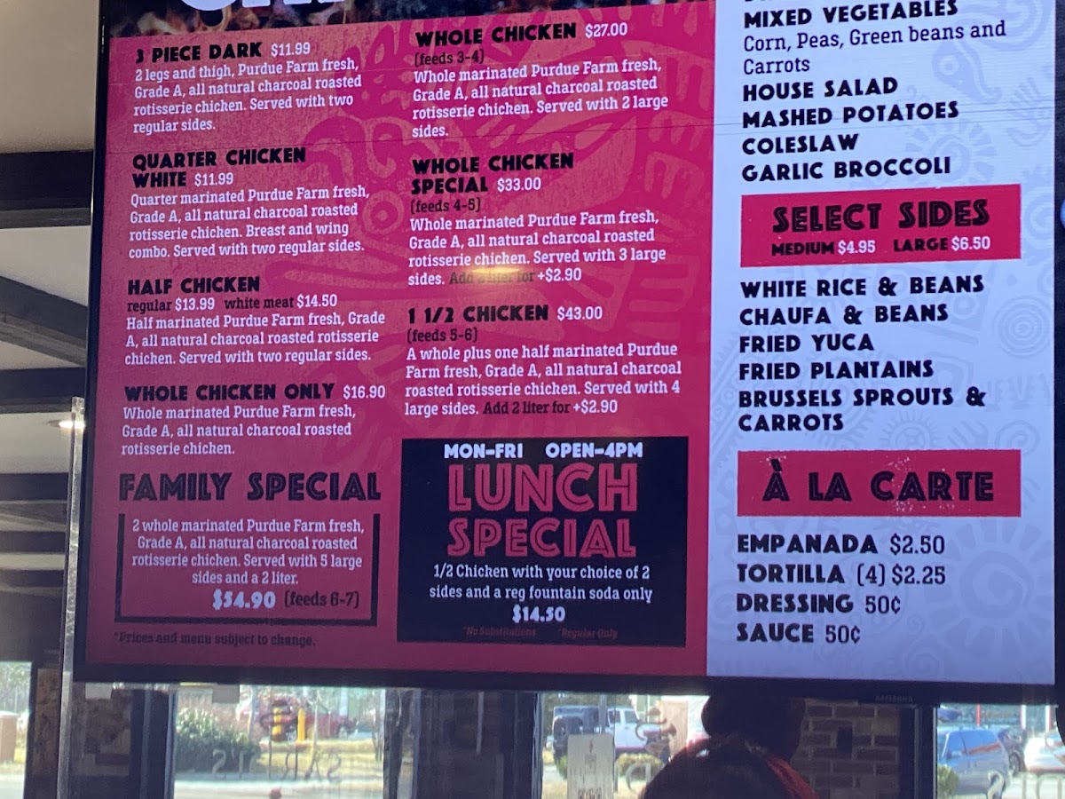 Upon entering, you’re greeted by a cozy and inviting atmosphere, with an open kitchen that lets the tantalizing aromas of marinated, charcoal-roasted chicken fill the air. Their famed rotisserie chicken is the crown jewel of the menu. With options like the Whole Chicken served with two delectable large sides for just $39.81, or the generous 1 ½ Chickens with four sides for $63.15, the portions are as plentiful as they are flavorful.